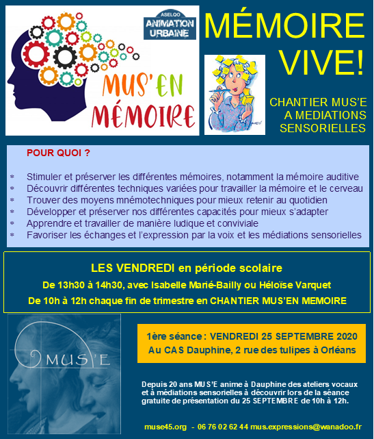 Les intervenants des MATINÉES MUS’E à DAUPHINE vous donnent rendez-vous VENDREDI 25 SEPTEMBRE 2020 de 10 à 12 heures au Centre d’Animation Sociale Aselqo Dauphine à Orléans