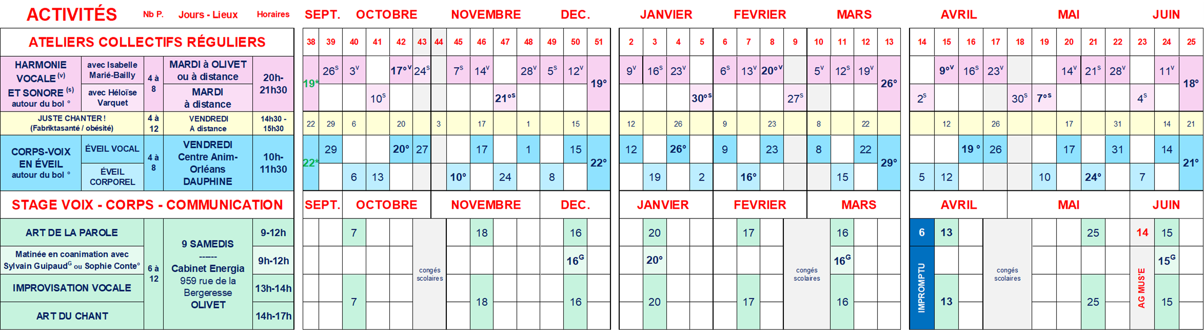 Le calendrier 2023-2024 et les tarifs de toutes les activités sont sur le Passeport Adhérent que chaque participant reçoit à son inscription.