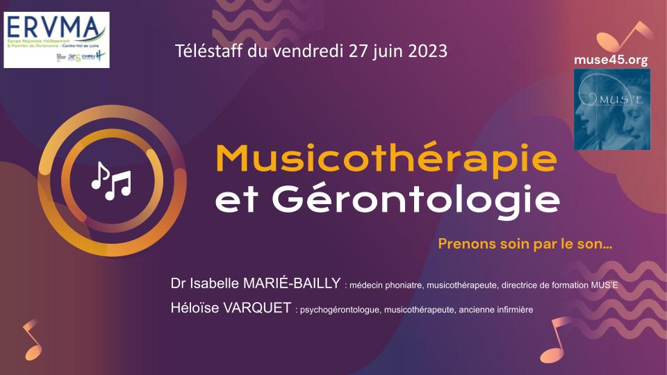 Présentation de la musicothérapie en gérontologie, au téléstaff de l’Équipe Régionale Vieillissement et Maintien de l’Autonomie ERVMA Centre-Val de Loire, le 27 juin 2023 – Replay téléstaff