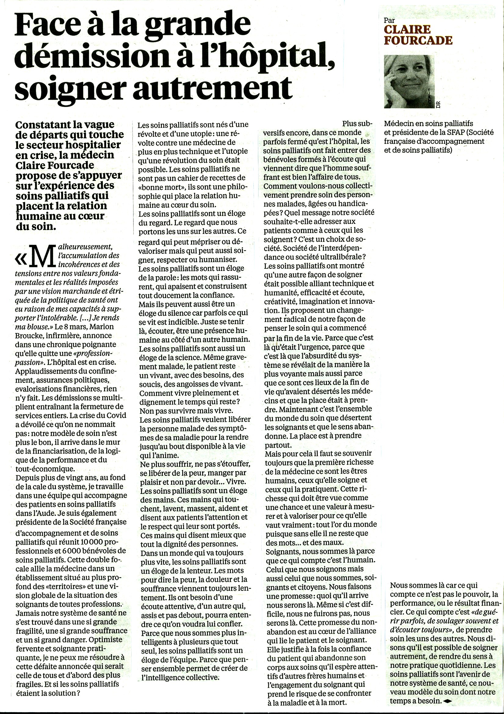 La médecine se doit d’évoluer vers un modèle intégrant toutes les ressources humaines : médecins, paramédicaux et tous les professionnels de santé aux approches complémentaires, qu’elles soient psychocorporelles, artistiques, sportives… Chacun d’entre nous, soignant, soigné, aidant, aidé, est concerné !