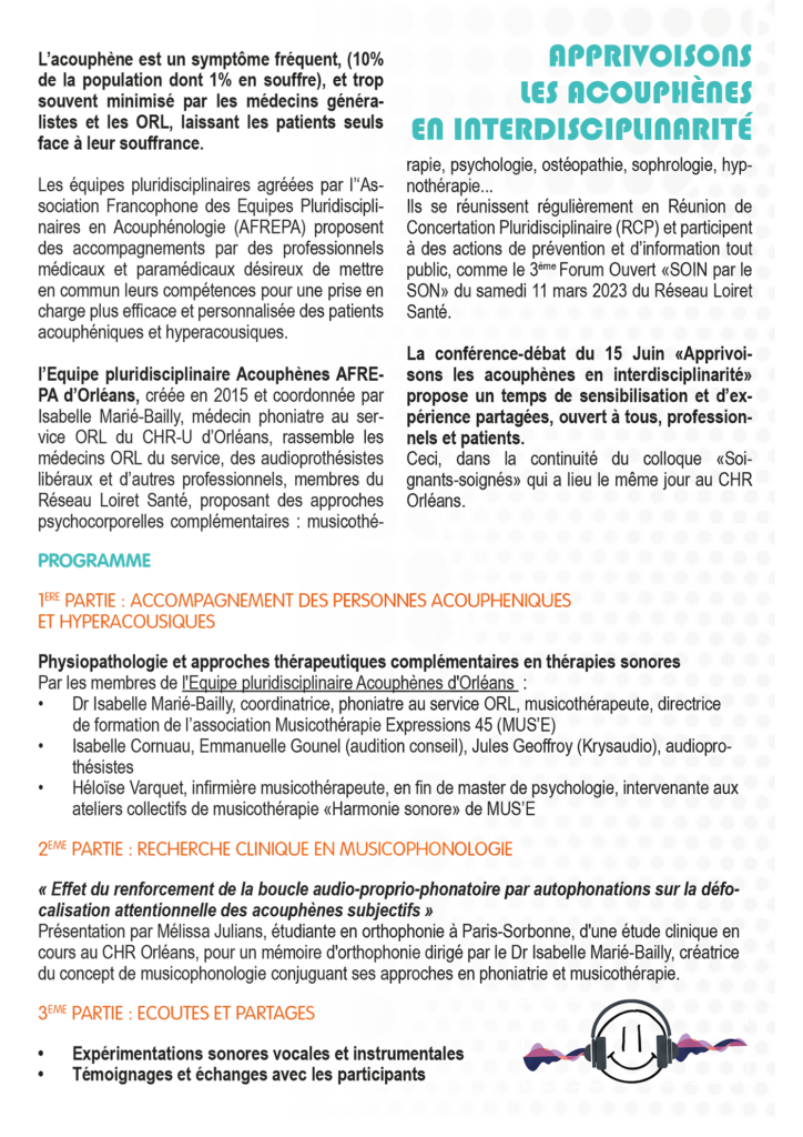 Au sein de l’Equipe pluridisciplinaire Acouphènes d’Orléans, MUS’E participe activement à la recherche en acouphénologie en développant une approche spécifique originale en musicophonologie, entre phoniatrie et musicothérapie, qui a été présentée lors de la conférence-débat du 15 juin, au CHRO ou à distance.