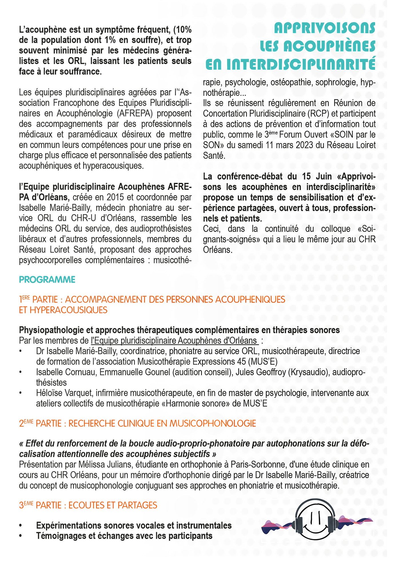 - Dr Isabelle Marié-Bailly, coordinatrice, phoniatre au service ORL, musicothérapeute, directrice de formation de l’association Musicothérapie Expressions 45 (MUS’E)