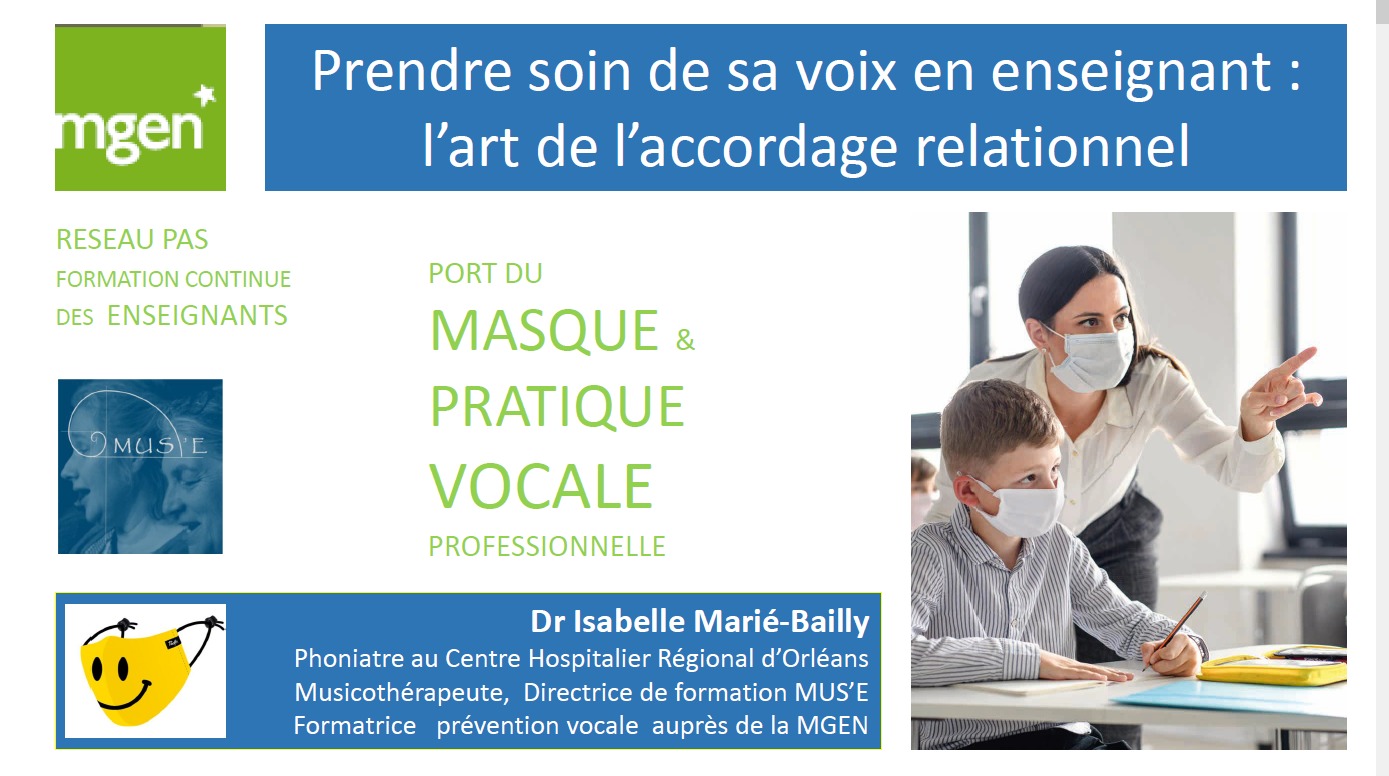 Une formation CNRS en webinaire, “Communiquer et enseigner avec un masque : comment s’en sortir ?“, pour La communauté de pratique MGEN En Prévention Des Troubles De La Voix, encourage à adopter une attitude positive, en acceptant le masque, non comme un obstacle et un empêchement, mais bien comme une invitation à développer nos capacités vocales et notre communication non verbale.