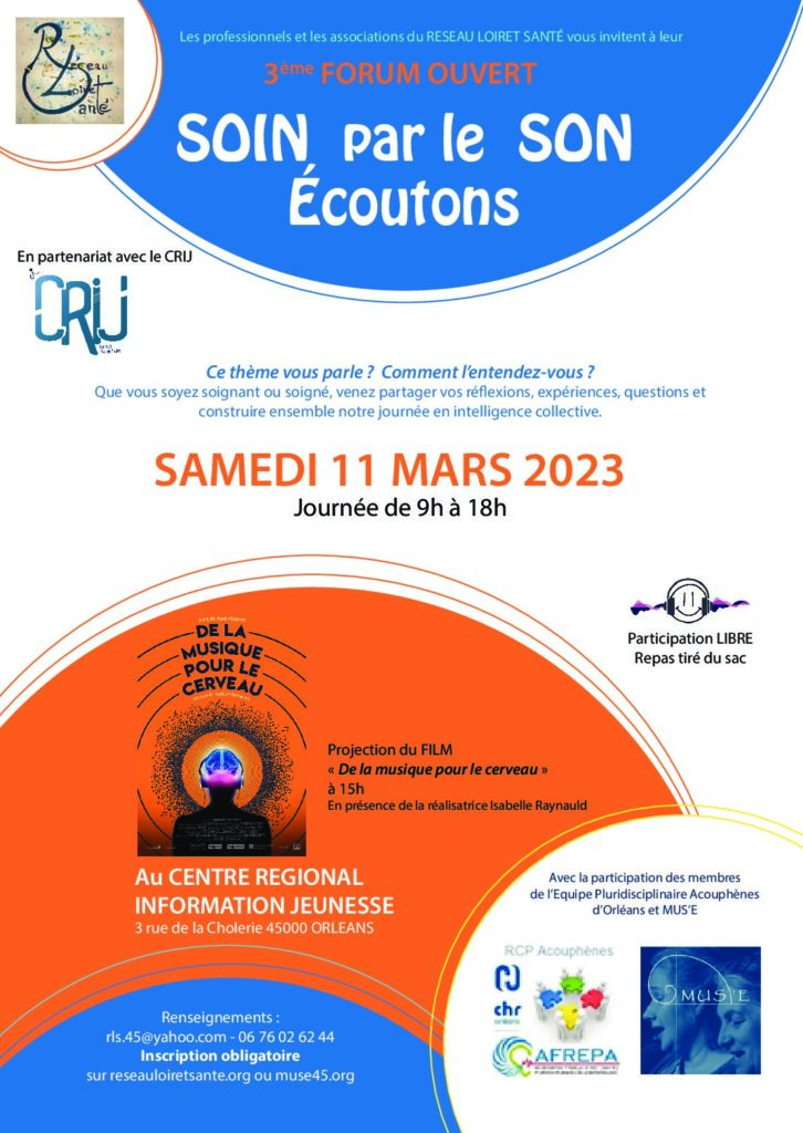 MUS’E est co-organisatrice de cette journée où elle proposera des ateliers autour de l’ECOUTE, du SON et du SOIN, en lien avec l’équipe pluridisciplinaire acouphènes d’Orléans, coordonnée par Isabelle Marié-Bailly.